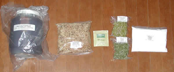 左から、モルトシロップ、乾燥モルト、アメリカンペールエール用ビール酵母、ホップ(ペレット)2種類、炭酸ガス用砂糖