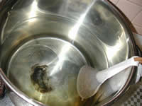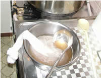 温度が170°F になったら、ネットに入れた乾燥モルトを取り出し、別のお湯でよく洗う。 洗って出たエキスは鍋に戻しておく。