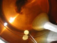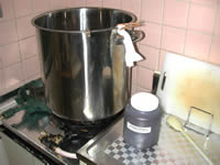 沸騰したら、ボイリングホップ(苦味付け用のホップ)を、吹きこぼれないよう火の大きさを加減しながら入れる。