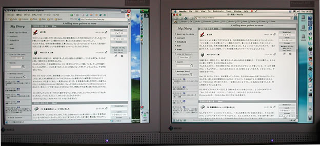 Mac OS Xになってから、表示精度っていうのか、なにがWindowsと同じ96dpiになっているんだな。試しに同じ解像度1024x768(うちのマックは最高でもこの解像度にしかならん)でWindows XPと並べてみた。写真ぢゃ全然分からないけど、日本語表示の綺麗さが特に明朝だとずいぶん違う。