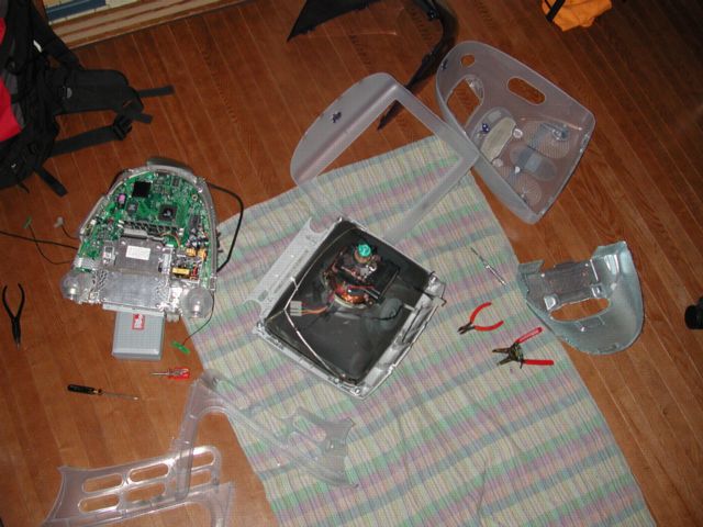 昼前に家に帰ってきたが、する事がない。それならば、以前より計画していた,iMac ラック化計画に取りかかるとするか。iMac DV には、外部モニタ用の端子がついているので、本体のブラウン管を外しても大丈夫と思っていたら,さにあらず。