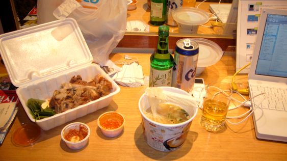 今回の最終日の晩餐は、昨晩ソウル大学留学生の素敵な2人に、連れて行ってもらったお店で食べきれなかった、ポッサムと豚足。 それと、コンビニで買ったオンミョン(にゅうめんとほぼ一緒)。 ソウルのコンビニ(GS25)って、日本みたいに麺物買っても割り箸くれないんでした。 そもそも、割り箸ってほとんど使わないって言ってたしな。お店で割り箸が出てくるのは、生きた蛸を食べるときだけだ。 しかたないので、櫛で食べる。しかし最後の日の食事がホテルで一人で櫛でとは... |