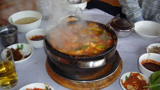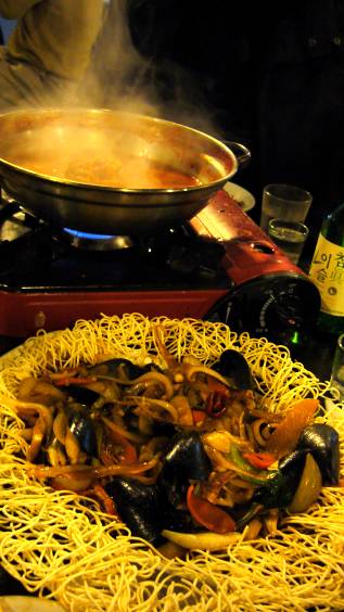 土曜の夜は、副社長のパクさんがシチョンまで来てくださった。シチョンの南側のプッチャンドンに行って、蛸の檄辛炒めナクチポックンを食べる。辛いけど美味しい。汗びっしょり。二人とも昨日飲み過ぎたので、お酒はちょっとだけ。(笑) ナクチポックンの他にも色々頼んでくれて、その中でもキムチチムが美味しかった。 うー、今回も美味い物いっぱい食べたなぁ。 |