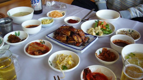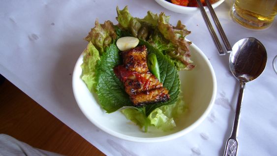 鰻だけで食べても、とっても美味しいけど、定番の食べ方(野菜に巻く)もかなりいける。 隣のじいさん2人は、これを2皿頼んでチャミスルをがんがん飲んでいた。元気やなぁ。 |