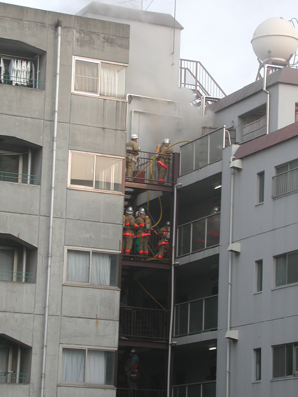 突入する場所がないらしく、電動鋸でドアを切っています。 消防士たちが大きな声で何か言ってますが、何を言っているのやら分かりません。 救急隊も来ましたが、幸い部屋の中には誰もいなかったようで、人的被害はなさそうです。